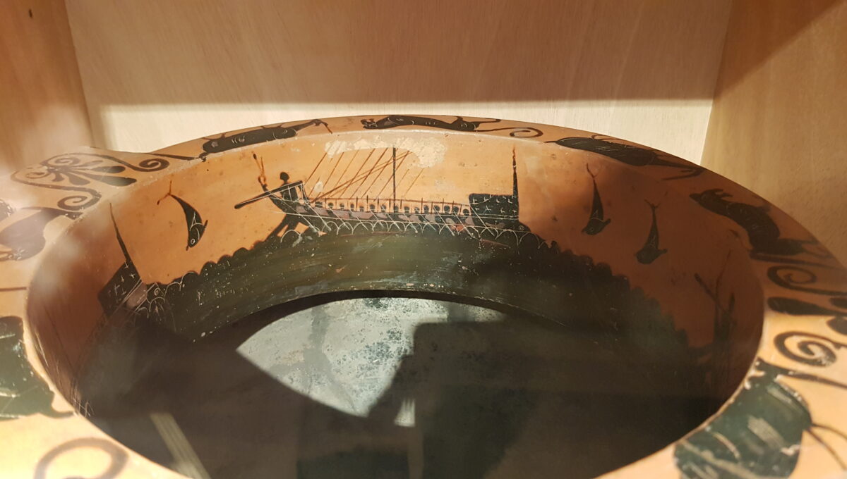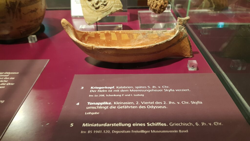 24. April 2026In der Griechenland-Sammlung des Basler Antikenmuseums befinden sich mehrere Weinmischgefässe (sog. Krater). Solche wurden bei Banketten und Symposien verwendet und sind daher grosszügig dekoriert, meist mit Szenen aus der griechischen Mythologie. Dieses hier ist aus Ton, stammt aus der Gegend von Athen und dürfte um 510 v. Chr. hergestellt worden sein. Vermutlich dienten die Schiffsmotive auf der Innenseite als Eichmarke, denn beim optimalen Füllungsgrad hatte es den Anschein, dass die Schiffe auf der Flüssigkeit fahren. Beim hier abgebildeten Schiff handelt es sich um eine Galeere. Der zwischen den Wellen erkennbare Rammsporn deutet darauf hin, dass sie auch für militärische Zwecke verwendet werden konnte. Der Künstler muss nicht nur ein hochtalentierter Maler gewesen sein, sondern auch etwas von Schiffen verstanden haben. Das beweist die fast schon fotografische Detailtreue. Auch die Proportionen stimmen – ganz im Gegensatz zum um 220 n. Chr. entstandenen Neumagener Weinschiff, von dem ein Abguss im Garten des Schifferhauses steht.